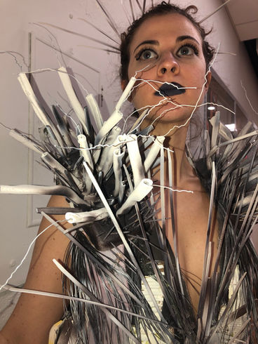 Sustainable creativity comes alive through problem-solving. A trip to the zoo, a unique animal subject, a $15 budget, and recycled household items provide the backdrop to the porcupine costume. Allowing my imagination to run wild, I created a porcupine costume out of plastic forks, zip ties, food cartons, wrappers, and spray paint. Bringing to life a fashionable porcupine, my creation was featured in a show during NY Fashion week.